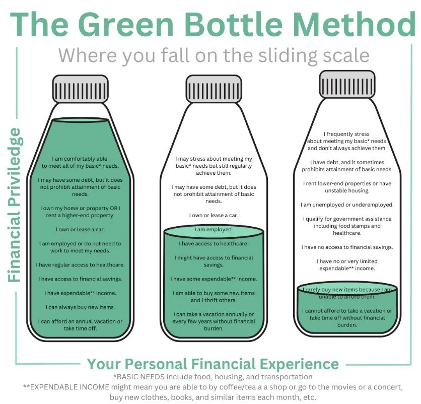 The foundations of my life and work are community care and mutual aid, which is why I’ve structured my business pricing using the green bottle sliding scale method to account for wealth disparities that systematically affect marginalized communities. My pricing intentionally creates space for people to pay according to their means while still sustaining the work and redistributing resources more equitably. This model centers dignity, reduces barriers to entry, and acknowledges that true community resilience depends on flexible, intentional economic practices that prioritize people over profit.